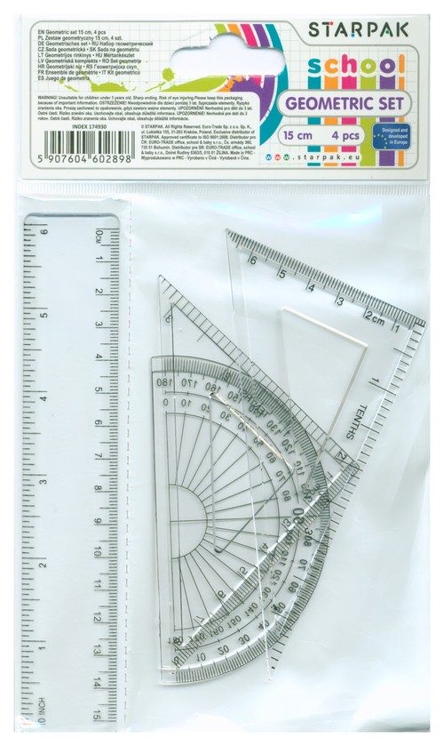 Zestaw geometryczny składający się z linijki, 2 ekierek oraz kątomierza.