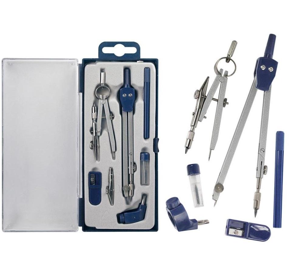 Zestaw zawiera dwa cyrkle: składany z łamanym ramieniem oraz precyzyjny z końcówką do tuszu oraz końcówkę do kreślenia tuszem, temperówkę, końcówkę do rapidografów, zapasowy grafit.