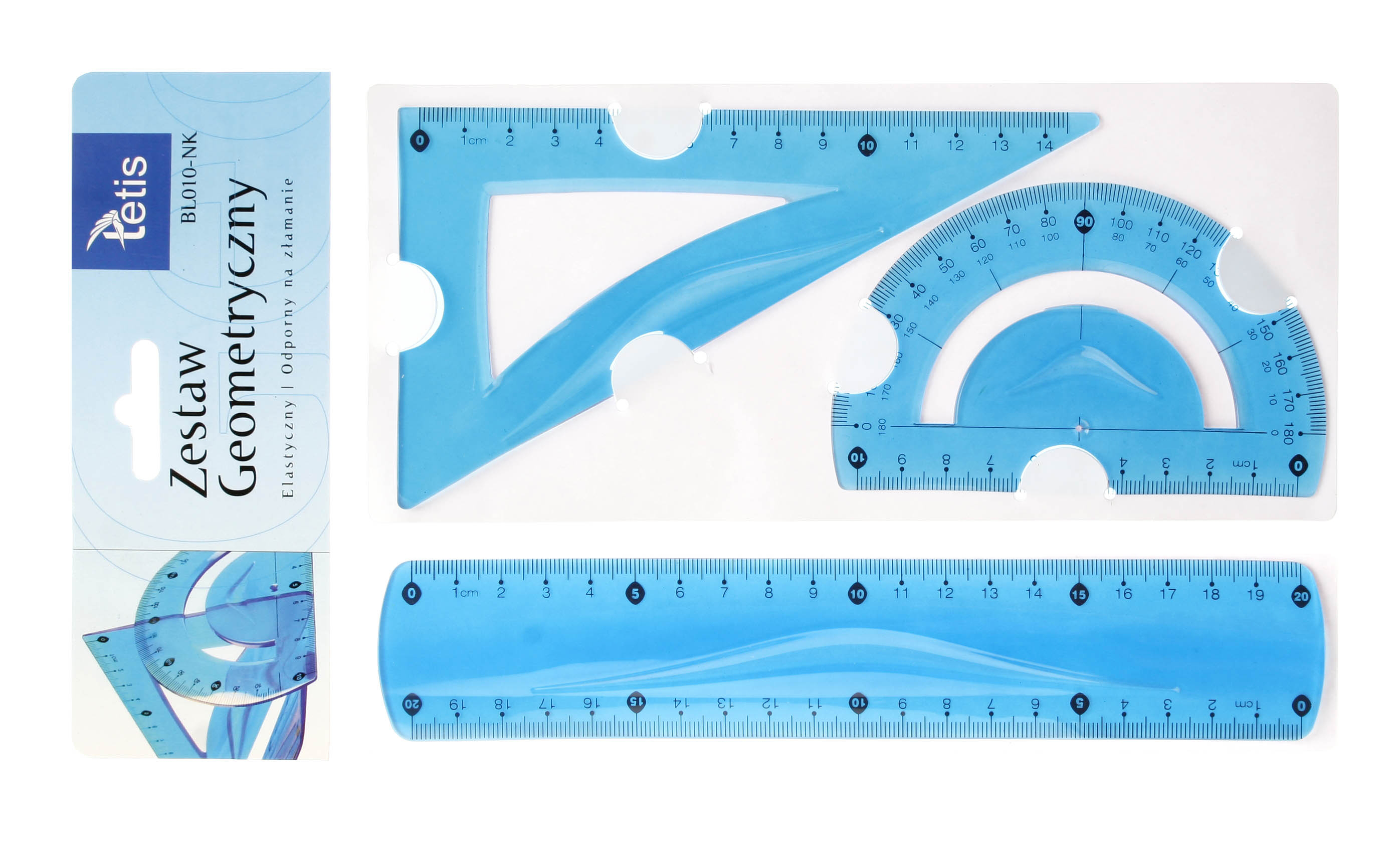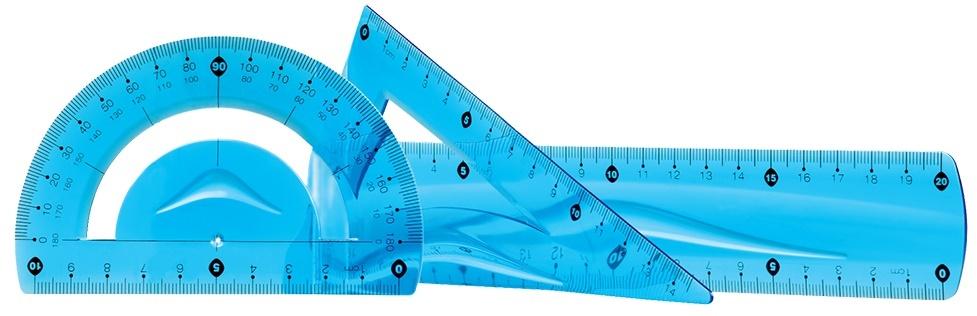 Zestaw zawiera: linijkę 20 cm ze skalą po obu stronach, kątomierz 10 cm, ekierka 15 cm