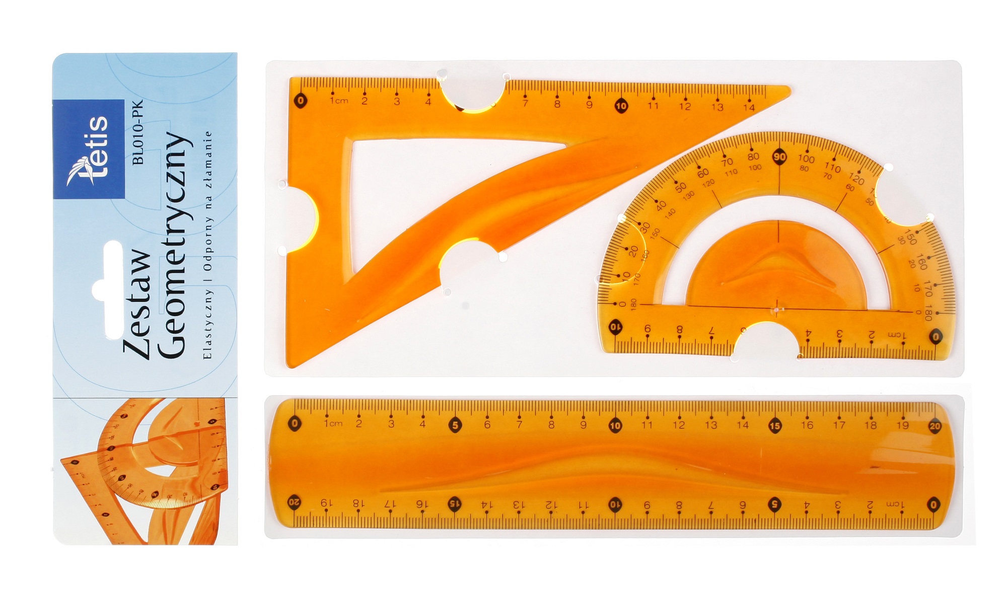 Zestaw zawiera: linijkę 20 cm ze skalą po obu stronach, kątomierz 10 cm, ekierka 15 cm