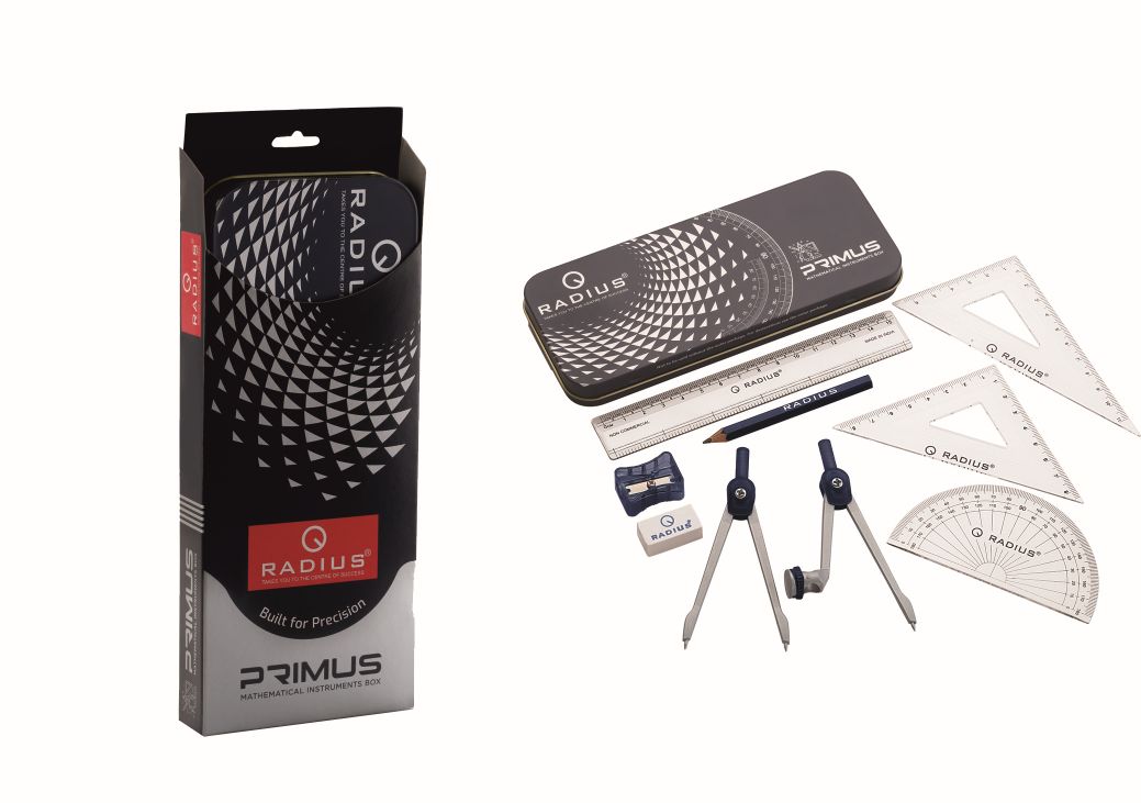 Zestaw geometryczny w metalowym opakowaniu, zawiera 9 elementów: 2 x cyrkiel, ołówek, 2 x ekierka, kątomierz, linijka, temperówka, gumka
