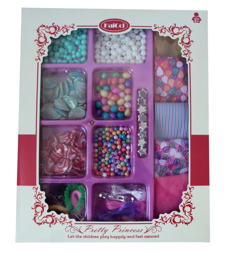 Zestaw koralików, tasiemek, gumek, spinek i żyłek.