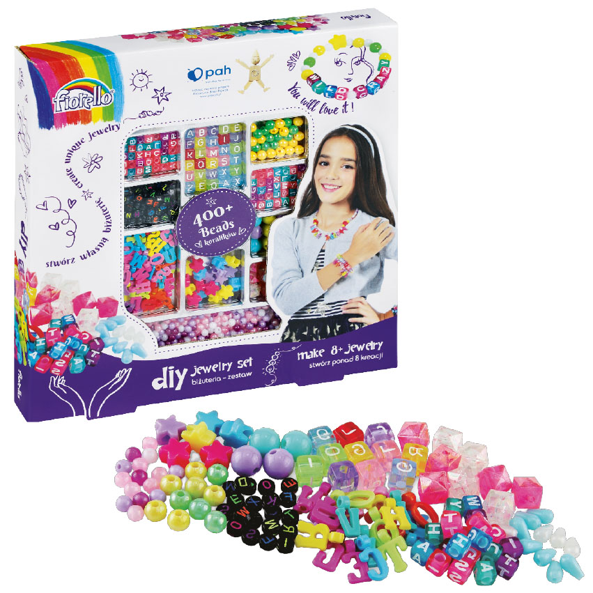 w zestawie: koraliki, alfabet: koraliki/charmsy, żyłki, gumka, akcesoria ponad 400 elementów zgodne z wymaganiami Unii Europejskiej x