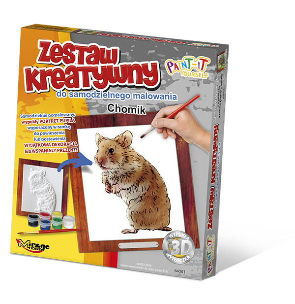 Zestawy kreatywne od Mirage Hobby proponują kolekcję obrazków, których bohaterami są konkretne rasy zwierząt. realistyczne odzwierciedlenie danej rasy psa, kota, konia, czy futrzaka, wyróżnia tę serię na tle innych zestawów do samodzielnego malowania. Kolekcja obejmuje 4 serie po 8 wzorów. Np. w serii koni znajdziemy konia: andaluzyjskiego, angielskiego, arabskiego, bretońskiego, Holsztyńskiego, Quoter Horse, Mustanga, Trakeńskiego. W serii psów nie zabrakło choćby yorka. Obrazek pupila w Zestawach Kreatywnych Mirage Hobby, to wypukła wytłoczka 3D. Ponieważ jest ona wykonana z plastiku, możliwe jest umycie obrazka ciepłą wodą z mydłem i powtórne jego pomalowanie. Dzięki temu można poprawiać i dopracowywać swoje dzieło do uzyskania pożądanego efektu. x