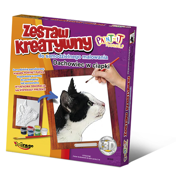 Zestawy kreatywne od Mirage Hobby proponują kolekcję obrazków, których bohaterami są konkretne rasy zwierząt. realistyczne odzwierciedlenie danej rasy psa, kota, konia, czy futrzaka, wyróżnia tę serię na tle innych zestawów do samodzielnego malowania. Kolekcja obejmuje 4 serie po 8 wzorów. Np. w serii koni znajdziemy konia: andaluzyjskiego, angielskiego, arabskiego, bretońskiego, Holsztyńskiego, Quoter Horse, Mustanga, Trakeńskiego. W serii psów nie zabrakło choćby yorka. Obrazek pupila w Zestawach Kreatywnych Mirage Hobby, to wypukła wytłoczka 3D. Ponieważ jest ona wykonana z plastiku, możliwe jest umycie obrazka ciepłą wodą z mydłem i powtórne jego pomalowanie. Dzięki temu można poprawiać i dopracowywać swoje dzieło do uzyskania pożądanego efektu. x