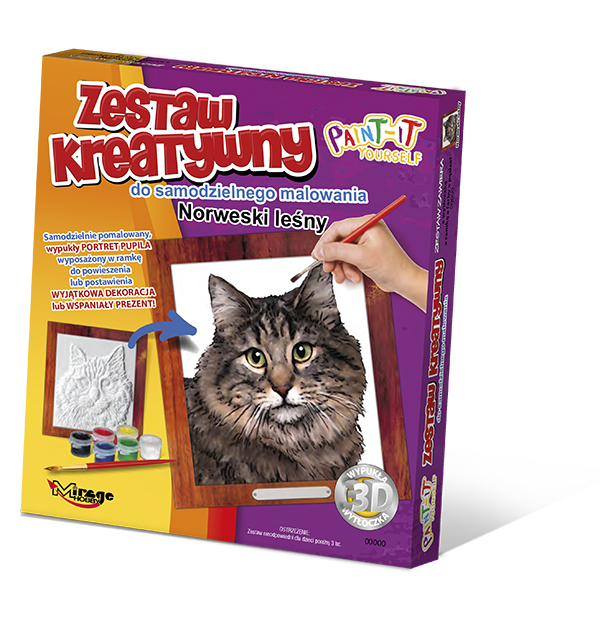 Zestawy kreatywne od Mirage Hobby proponują kolekcję obrazków, których bohaterami są konkretne rasy zwierząt. realistyczne odzwierciedlenie danej rasy psa, kota, konia, czy futrzaka, wyróżnia tę serię na tle innych zestawów do samodzielnego malowania. Kolekcja obejmuje 4 serie po 8 wzorów. Np. w serii koni znajdziemy konia: andaluzyjskiego, angielskiego, arabskiego, bretońskiego, Holsztyńskiego, Quoter Horse, Mustanga, Trakeńskiego. W serii psów nie zabrakło choćby yorka. Obrazek pupila w Zestawach Kreatywnych Mirage Hobby, to wypukła wytłoczka 3D. Ponieważ jest ona wykonana z plastiku, możliwe jest umycie obrazka ciepłą wodą z mydłem i powtórne jego pomalowanie. Dzięki temu można poprawiać i dopracowywać swoje dzieło do uzyskania pożądanego efektu. x