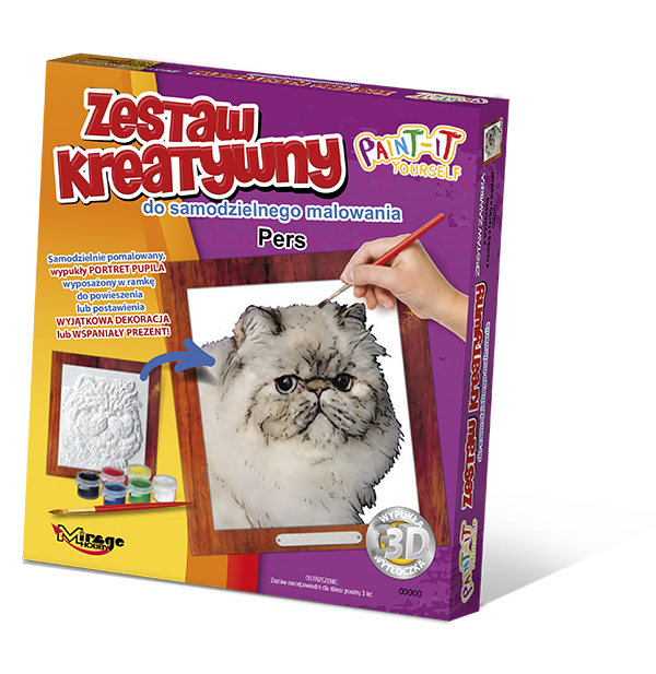 Zestawy kreatywne od Mirage Hobby proponują kolekcję obrazków, których bohaterami są konkretne rasy zwierząt. realistyczne odzwierciedlenie danej rasy psa, kota, konia, czy futrzaka, wyróżnia tę serię na tle innych zestawów do samodzielnego malowania. Kolekcja obejmuje 4 serie po 8 wzorów. Np. w serii koni znajdziemy konia: andaluzyjskiego, angielskiego, arabskiego, bretońskiego, Holsztyńskiego, Quoter Horse, Mustanga, Trakeńskiego. W serii psów nie zabrakło choćby yorka. Obrazek pupila w Zestawach Kreatywnych Mirage Hobby, to wypukła wytłoczka 3D. Ponieważ jest ona wykonana z plastiku, możliwe jest umycie obrazka ciepłą wodą z mydłem i powtórne jego pomalowanie. Dzięki temu można poprawiać i dopracowywać swoje dzieło do uzyskania pożądanego efektu. x