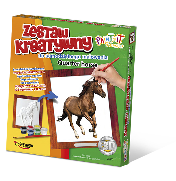 Zestawy kreatywne od Mirage Hobby proponują kolekcję obrazków, których bohaterami są konkretne rasy zwierząt. realistyczne odzwierciedlenie danej rasy psa, kota, konia, czy futrzaka, wyróżnia tę serię na tle innych zestawów do samodzielnego malowania. Kolekcja obejmuje 4 serie po 8 wzorów. Np. w serii koni znajdziemy konia: andaluzyjskiego, angielskiego, arabskiego, bretońskiego, Holsztyńskiego, Quoter Horse, Mustanga, Trakeńskiego. W serii psów nie zabrakło choćby yorka. Obrazek pupila w Zestawach Kreatywnych Mirage Hobby, to wypukła wytłoczka 3D. Ponieważ jest ona wykonana z plastiku, możliwe jest umycie obrazka ciepłą wodą z mydłem i powtórne jego pomalowanie. Dzięki temu można poprawiać i dopracowywać swoje dzieło do uzyskania pożądanego efektu. x