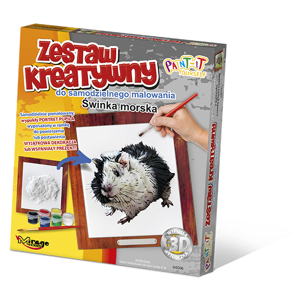Zestawy kreatywne od Mirage Hobby proponują kolekcję obrazków, których bohaterami są konkretne rasy zwierząt. realistyczne odzwierciedlenie danej rasy psa, kota, konia, czy futrzaka, wyróżnia tę serię na tle innych zestawów do samodzielnego malowania. Kolekcja obejmuje 4 serie po 8 wzorów. Np. w serii koni znajdziemy konia: andaluzyjskiego, angielskiego, arabskiego, bretońskiego, Holsztyńskiego, Quoter Horse, Mustanga, Trakeńskiego. W serii psów nie zabrakło choćby yorka. Obrazek pupila w Zestawach Kreatywnych Mirage Hobby, to wypukła wytłoczka 3D. Ponieważ jest ona wykonana z plastiku, możliwe jest umycie obrazka ciepłą wodą z mydłem i powtórne jego pomalowanie. Dzięki temu można poprawiać i dopracowywać swoje dzieło do uzyskania pożądanego efektu. x