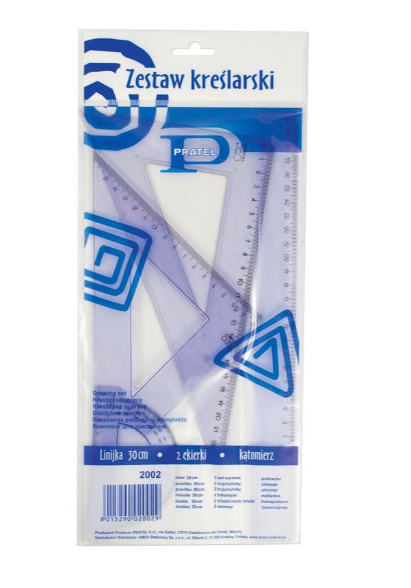 Zestaw kreślarski duży: 2 standardowe przezroczyste ekierki 25 cm 45/60 stopni, kątomierz 10 cm/180 stopni, linijka 30 cm. Elementy zestawu posiadają trwałą nieścieralną podziałkę, elemnty mają zaokrąglone rogi dla bezpieczeństwa użytkownika. Wykonany precyzyjny nadruk skali ( do 0.001 cm), różne kolory nadruków, wyprodukowana zgodnie z normami europejskimi.