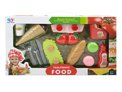kanapka do składania- sałata, ser,szynka,pomidory sztućce- łyżka, widelec,nóż 1 lód frytki truskawka do krojenia frytki 2 babeczki kubek pucharek x