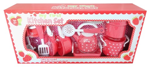 Zestaw plastikowych naczyń akcesoriów do zabawy w kuchnię.