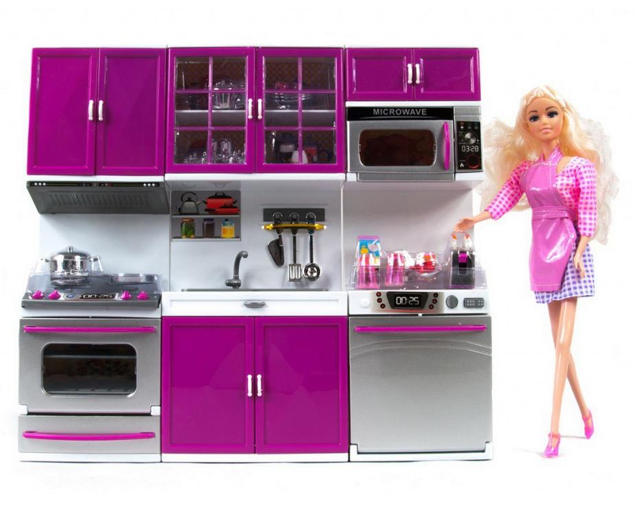 W skład zestawu wchodzi: - lalka, - zestaw mebli kuchennych, - kuchenka wraz z otwieranym piekarnikiem, - kuchenka mikrofalowa, - element ze zlewozmywakiem, - zmywarka, - drobne akcesoria kuchenne: garnki, toster, inne przyrządy kuchenne. Kuchenka oraz kuchenka mikrofalowa dodatkowo po naciśnięciu przycisku świeci światło oraz wydaje dźwięk gotowania. Zabawka posiada certyfikat CE. Zabawka przeznaczona dla dzieci powyżej 3go roku życia. Duży zestaw interaktywny z kuchnią dla lalek i lalką. Wymiary: 57x34,6x8,5 cm Waga: 1,75 kg Zasilanie: 2xAAA ( w zestawie) x