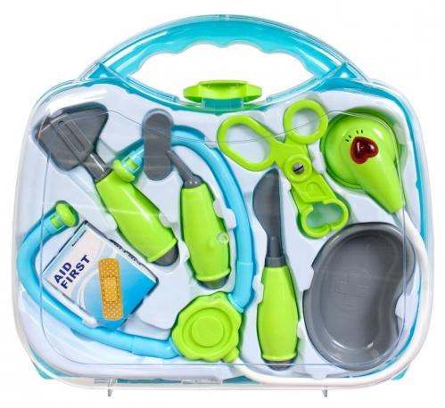 Ten podręczny zestaw w zamykanej walizeczce z rączką pomieści wszystkie niezbędne akcesoria lekarskie. Zestaw zawiera: stetoskop, skalpel, nożyczki do bandażu, plastry. Zestaw zawiera 7 elementów. Produkt wykonany z plastiku. Przeznaczony dla dzieci do 3 lat.