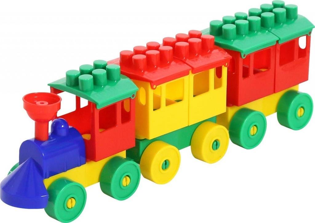 Lokomotywa z 2 wagonem składa się z mniejszych elementów. Są to klocki, koła, ściany i dach wagonów i lokomotywy. Konstruktor składa się z 27 elementów.