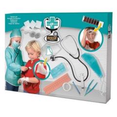 Zabawa w lekarza to jedna z ulubionych zabaw dzieci. Z tym zestawem Twoje dziecko będzie mogło zamienić się w prawdziwego lekarza. Zestaw zawiera prawdziwy, działający stetoskop, termometr, plaster, 2 rolki bandaża, gazę, 2 strzykawki, pincetę, chustę, maskę, czapkę na głowę. Wyprodukowano w Holandii.
