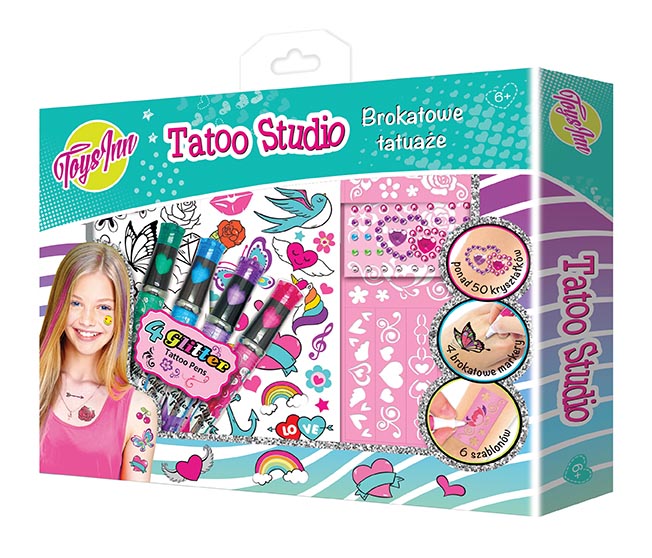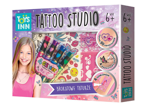 Opis produktuZasady bezpieczeństwaZestaw pozwala na tworzenie własnych, unikalnych tatuaży. Do wykorzystania są brokatowe tatuaże, szablony, jednobarwne tatuaże, które można pokolorować dołączonymi brokatowymi markerami. Gotowe tatuaże, można ozdobić przyklejanymi kryształkami. Zestaw rozwija kreatywność dzieci, poprzez możliwość tworzenia własnych oryginalnych wzorów. W komplecie znajdują się: 4 brokatowe markery do tatuaży (zielony, niebieski, fioletowy, różowy), 6 szablonów wielokrotnego użytku, 24 brokatowe tatuaże, 27 jednobarwnych tatuaży, 57 samoprzylepnych kryształków w różnych kolorach. Zestaw od 6 roku życia. x