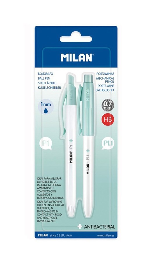 Zestaw: długopis P1 i ołówek automatyczny PL1. Obudowa długopisu i ołówka zawiera biocyd i poddana jest działaniu szkła fosforanowo-srebrowego (CAS 308069-39-8) o działaniu przeciwbakteryjnym. Idealne do poprawy higieny w szkole, w biurze, w środowiskach mających kontakt z żywnością i środowiskach sanitarnych, przychodniach, szpitalach. Długopis P1 z niebieskim tuszem, pstrykany. Przybliżona długość pisania: 1200 metrów. Końcówka 1 mm. Atrament wyprodukowany w Niemczech. Ołówek automatyczne PL1 z grafitem HB 0,7 mm, idealny do pisania. Grafit HB jest średnio twardy, dzięki czemu nadaje się do pisania i rysowania. Posiadają na końcu wykręcaną długą gumkę do wymazywania. Oryginalny produkt stworzony przez własny dział badawczo-rozwojowy MILAN. Rozmiar długopisu: 14,1 x 1,7 x 1 cm. Rozmiar ołówka: 14,4 x 1,5 x 1,1 cm.