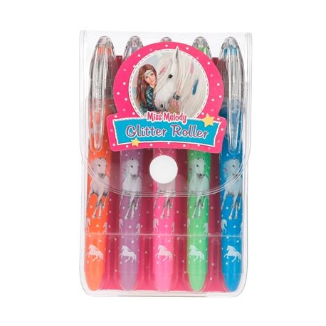 Zestaw 5 brokatowych mini żelpenów Miss Melody, z wizerunkiem koników. Kolory żelpenów: pomarańczowy, fioletowy, różowy, zielony, niebieski. Żelpeny w plastikowym etui.