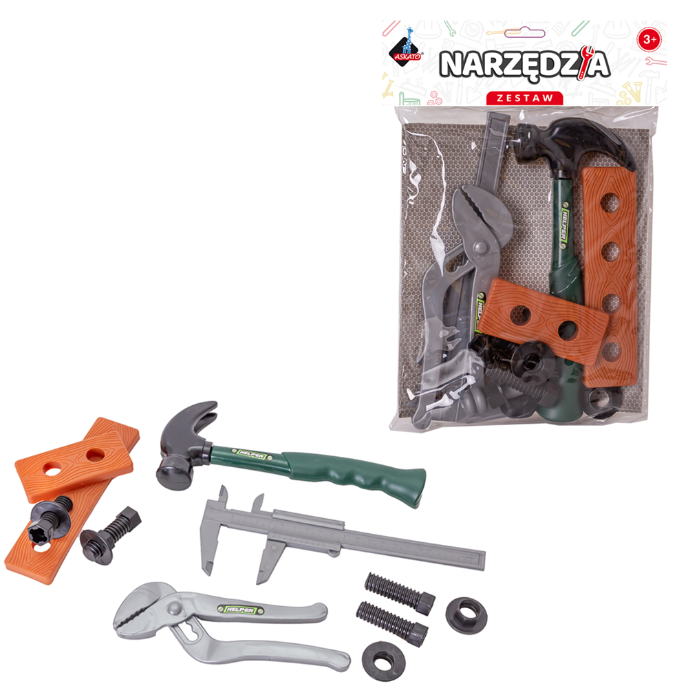 Opis produktuZasady bezpieczeństwaSuper zestaw dla małego majsterkowicza, który zawiera najważniejsze zabawkowe narzędzia, które przydają się w codziennych naprawach. Zestaw zawiera 13 elementów: młotek lub klucz francuski (w zależności od wybranego wariantu) piła suwmiarka klucz nastawny zestaw podkładek i śrubek 2 deseczki Wymiary opakowania: 20 x 4 x 31 cm x