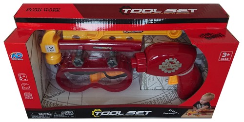 Zestaw narzędzi majsterkowicza 9 elementów, w tym gogle i kręcąca się wiertarka.