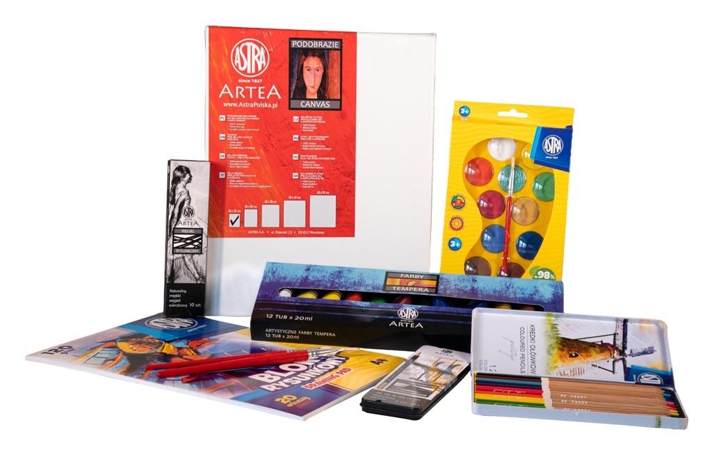 - podobrazie malarskie Astra 24x30cm, - farby tempera Astra 12 kolorów -20ml, - farby akwarelowe Astra 12 kolorów, - ołówki do szkicowania w metalowym pudełku 6 sztuk, - węgiel naturalny rysunkowy Astra Artea 10 sztuk 3-6mm, - kredki z drewna cedrowego w metalowym pudełku Astra Prestige 12 kolorów, - blok techniczny A4, - pędzel płaski Astra nr 6, - pędzel płaski Astra nr 12. x