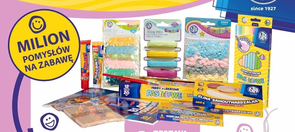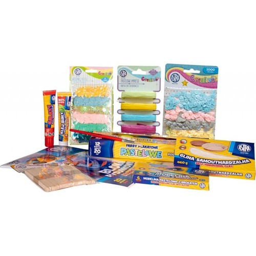 - farby pastelowe 12 kolorów 20ml, - modelina pastelowa z brokatem Astra 6 kolorów, - glina samoutwardzalna Astra 460g - biała, - kredki ołówkowe dwustronne pastelowe 12=24, - confetti cekinowe kółka na blistrze - mix 5 kolorów pastelowych - 1000 sztuk, - pastelowe inspiracje - rafia do dekoracji 6 x 5 metrów, - zestaw do dekoracji Astra Creativo - Wiosenne pastele, - patyczki drewniane 50 sztuk, - blok techniczny A4, - klej uniwersalny Astra Galaxy tuba 40ml + 30% gratis (52ml), - klej biały 45ml display - zielona herbata, - pędzel szkolny okrągły Astra nr 14. x