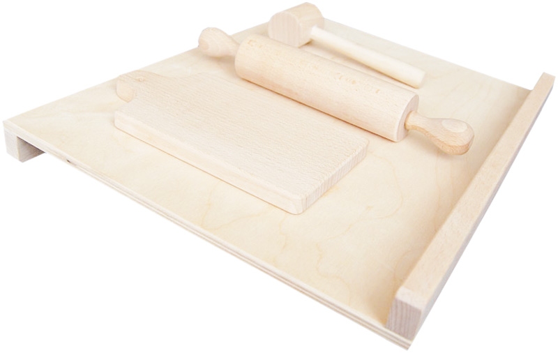 Komplet składający się z drewnianej stolnicy, wałka, deski oraz tłuczka zachęca do czynnego poznawania zajęć wykonywanych w gospodarstwie domowym. Wszystko w dostosowanym do dziecka mniejszym rozmiarze.