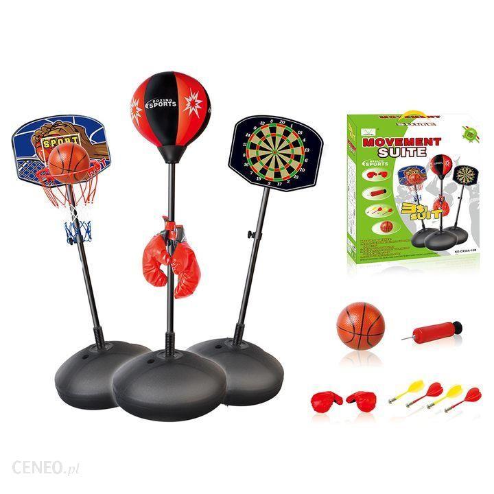 Uniwersalny zestaw zabaw sportowych dla każdego chłopca, 3 zabawy w jednym zestawie, do dyspozycji mamy tzw. ?gruszkę? do zabawy w boks wraz z rękawicami, tarczę z lotkami do darta oraz tarczę do gry w koszykówkę wraz z piłką i pompką. Zabawka posiada certyfikat CE. Zabawka przeznaczona dla dzieci powyżej 3go roku życia.