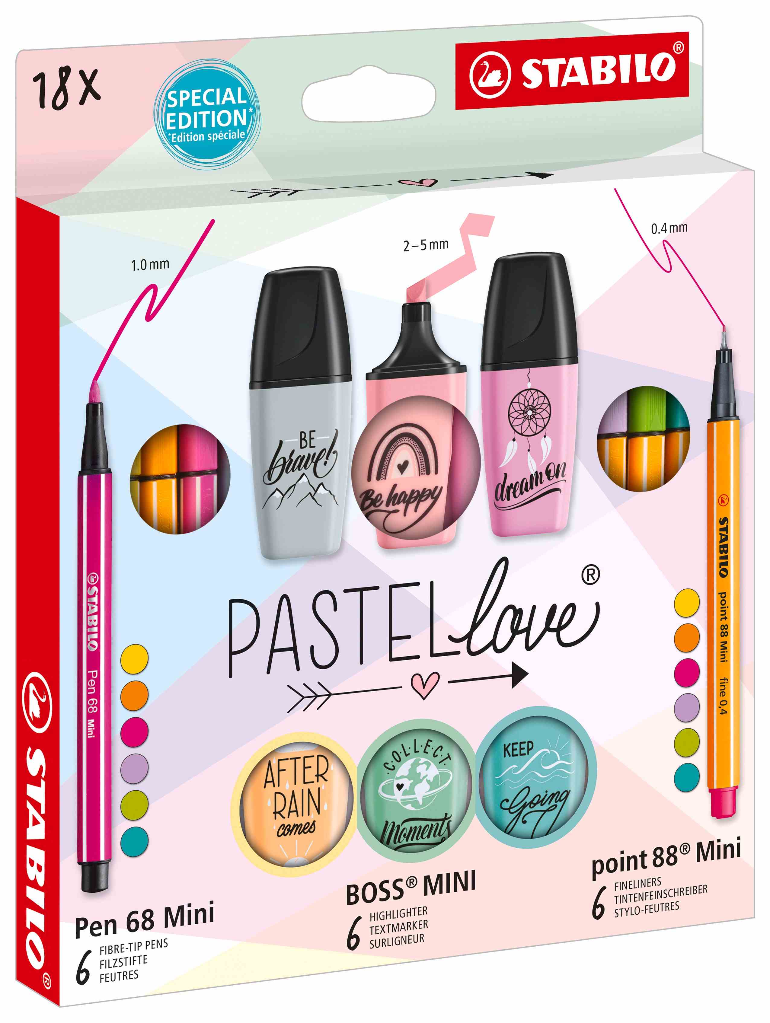 Opis produktuZasady bezpieczeństwaDoskonale znane mini cienkopisy STABILO point 88 Mini, flamastry STABILO Pen 68 Mini oraz zakreślacze STABILO BOSS MINI pastel zostały zapakowane w efektowne etui. Doskonały pomysł na prezent lub każdą inną okazję. Zestaw 18 pastelowych produktów: po 6 szt. zakreślaczy, cienkopisów, flamastrów w mini formacie.