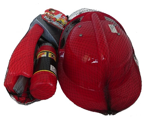 Zestaw do zabawy w strażaka z hełmem, toporkiem, łomem, gaśnicą, radiem i odznaką.