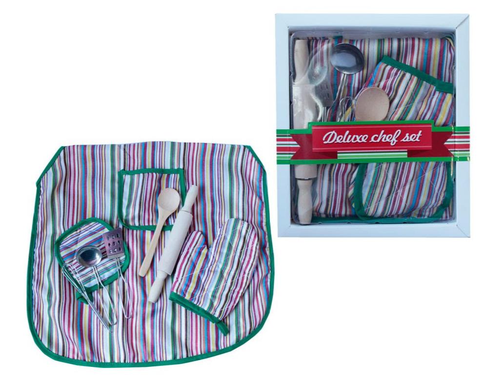 Opis produktuZasady bezpieczeństwaW zestawie 8 elementów: fartuszek, rękawica, łyżka drewniana, wałek, trzepaczka, nabierka, łyżka. x
