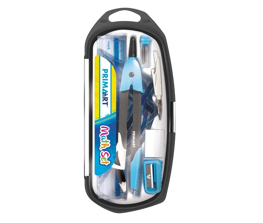 Zestaw matematyczny ,potrzebny do szkoły, składający się z linijki,ekierki,kątomierza,temperówki,gumki do mazania,grafitu,rysików,ołówka,cyrkla.