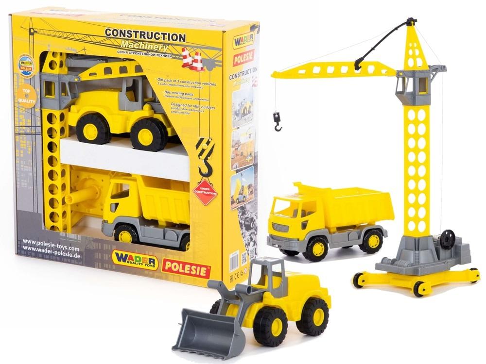 W skład zestawu wchodzą trzy pojazdy budowlane, bez których nie funkcjonowałaby żadna budowa. Wywrotka umożliwi wywiezienie zabawek z placu budowy, a unoszony kontener pozwoli na opróżnienie. Koparka posiada ruchome, szare ramię. Dźwig ma możliwość opuszczania haka, dzięki czemu można zaczepić i przenieść zabawki z miejsca na miejsce. Wózek utrzymany jest w kolorach żółto i szarym, ta kolorystyka kojarzy się z pojazdami budowy. Zapewni długie godziny zabawy na powietrzu oraz w pokoju dziecinnym. Wiele ekscytujących przygód przed nim, odgrywanie ról wpłynie na rozwój wyobraźni. x
