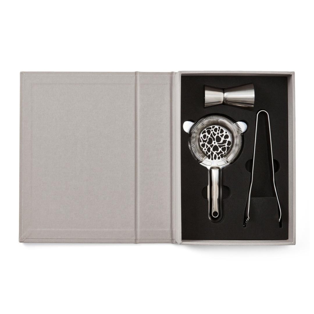 Akcesoria zapakowano w pudełko prezentowe wyścielone miękką pianką, przypominające książkę. W komplecie znajdują się: szczypce Ice Thong do podnoszenia lodu, sitko Hawthorne do filtrowania składników podczas nalewania koktajlu do szklanki Jigger do odmierzania płynów. W zestawie znajduje się także przewodnik po koktajlach i sposobach ich przyrządzania. Akcesoria wykonano ze stali nierdzewnej, można je myć w zmywarce.
