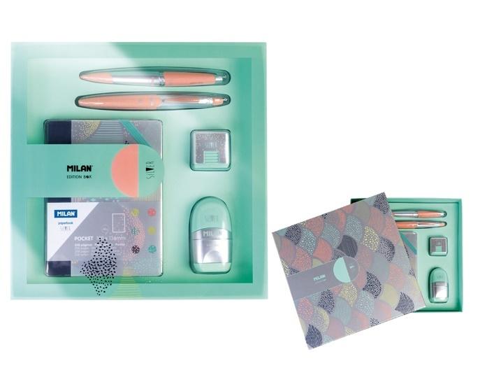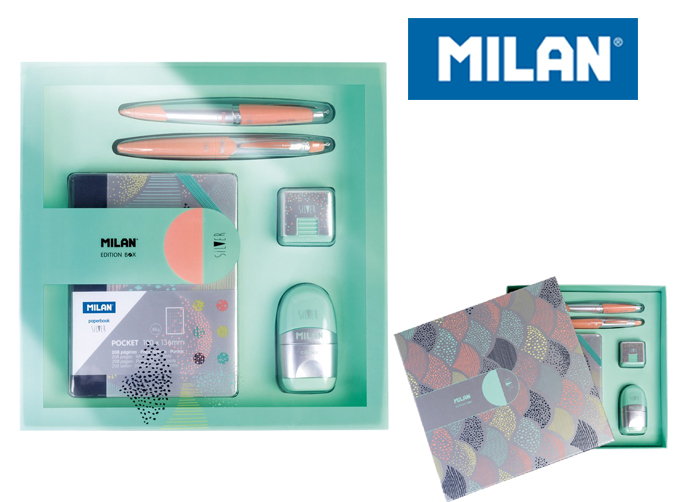 Zestaw upominkowy MILAN SILVER mix kolorów. Zawiera: notes SILVER mały z kieszonką na notatki, 208 kartek w kropki, papier biały 80g, temperówko-gumkę CAPSULE SILVER, gumkę 430 SILVER, ołówek mechaniczny CAPSULE SILVER Slim, długopis CAPSULE SILVER. Wszystko zapakowane w ekskluzywne pudełko z nadrukiem nawiązującym do kolekcji SILVER o wymiarach 22 x 22 x 0,3 cm.