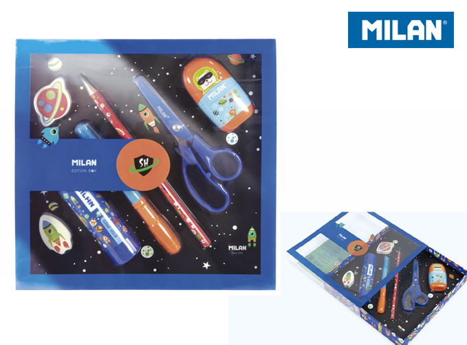Zestaw upominkowy MILAN SUPER HEROES SPACE w niebieskiej kolorystyce. Zawiera: temperówko - gumkę CAPSULE SHS z nadrukiem świecącym w ciemności ołówek trójkątnySUPER HEROES HB długopis dwustronny SWAY COMBI DUO klej magic w sztyfcie 21 g SUPER HEROES SPACE 2 gumki syntetyczne w kształcie i z nadrukiem SUPER HEROES SPACE nożyczki szkolne BASIC Wszystko zapakowane w ekskluzywne pudełko z nadrukiem nawiązującym do kloekcji SPACE o wymiarach 20,6 x 20 x 3,9 cm