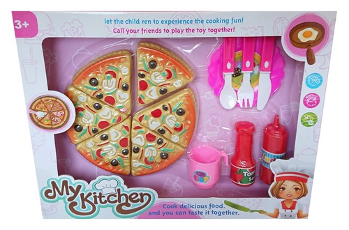 Zestaw do zabawy w gotowanie z plastikową pizzą z sześciu kawałkach i kompletem akcesoriów.