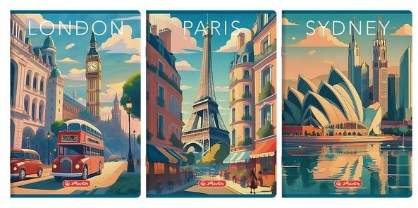 Miękkie, kartonowe, laminowane okładki pokryte matową folią Ilustracje przedstawiające znane miasta w stylu retro Okładki utrzymane w stonowanej kolorystyce, z dbałością o szczegóły Grzbiet zszywany zszywkami