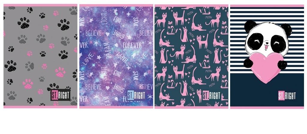 format A5 ilość kartek 32 liniatura linia podwójna dwukolorowa czerwony margines zaokrąglone rogi wkładka adresowa wkład zeszytu - papier offset, gramatura 70 g/m2 okładka - kredowa, laminowana modna grafika okładek koresponduje z wzornictwem artykułów tekstylnych ST.RIGHT