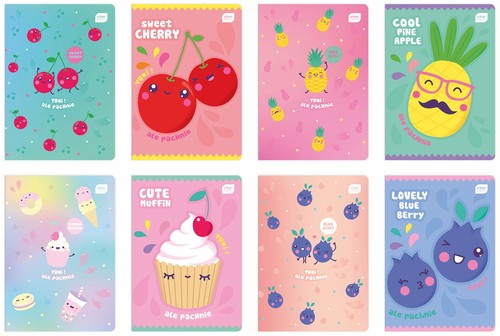 Opis produktuZasady bezpieczeństwaFormat: A5. Liczba kartek: 32. Zadruk w kratkę. Zaokrąglone rogi. Apetyczne zeszyty z pięknie pachnącymi okładkami w 4 zapachach: wiśni, ananasa, borówki i słodkim. Aby uwolnić zapach, należy potrzeć wyznaczone miejsce na okładce. Opakowanie zbiorcze 10 sztuk. Mix wzorów x