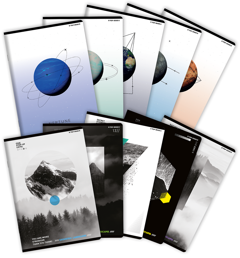 Dwie kolekcje w jednej to jeszcze więcej różnorodnych okładek do wyboru. Matowa folia i wybiórczy lakier UV nadają okładkom elegancji. Zadrukowane okładki wewnętrzne doskonale korespondują z ilustracjami na przednich okładkach. Miękkie okładki wykonane z lekkiego kartonu nie obciążają plecaka. Grzbiet zszywany zszywkami zapewnia trwałość zeszytów i wygodę pisania