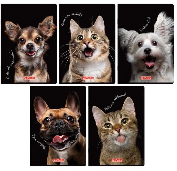 Miękkie, kartonowe, laminowane okładki pokryte matową folią Zdjęcia zwariowanych psów i kotów ze śmiesznymi tekstami Elegancki, czarny kolor tła na okładkach Grzbiet zszywany zszywkami