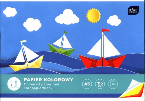 Zeszyt papierów kolorowych. Format A5, 10 kartek. 10 sztuk w opakowaniu zbiorczym. Producent Interdruk