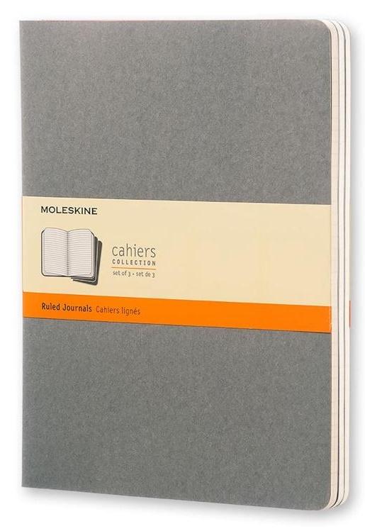 Zestaw 3 zeszytów XL w linie, w szarych okładkach. Zeszyty zawierają wewnątrz kieszonkę. Ostatnie 16 stron odłączanych. 120 stron w linie.