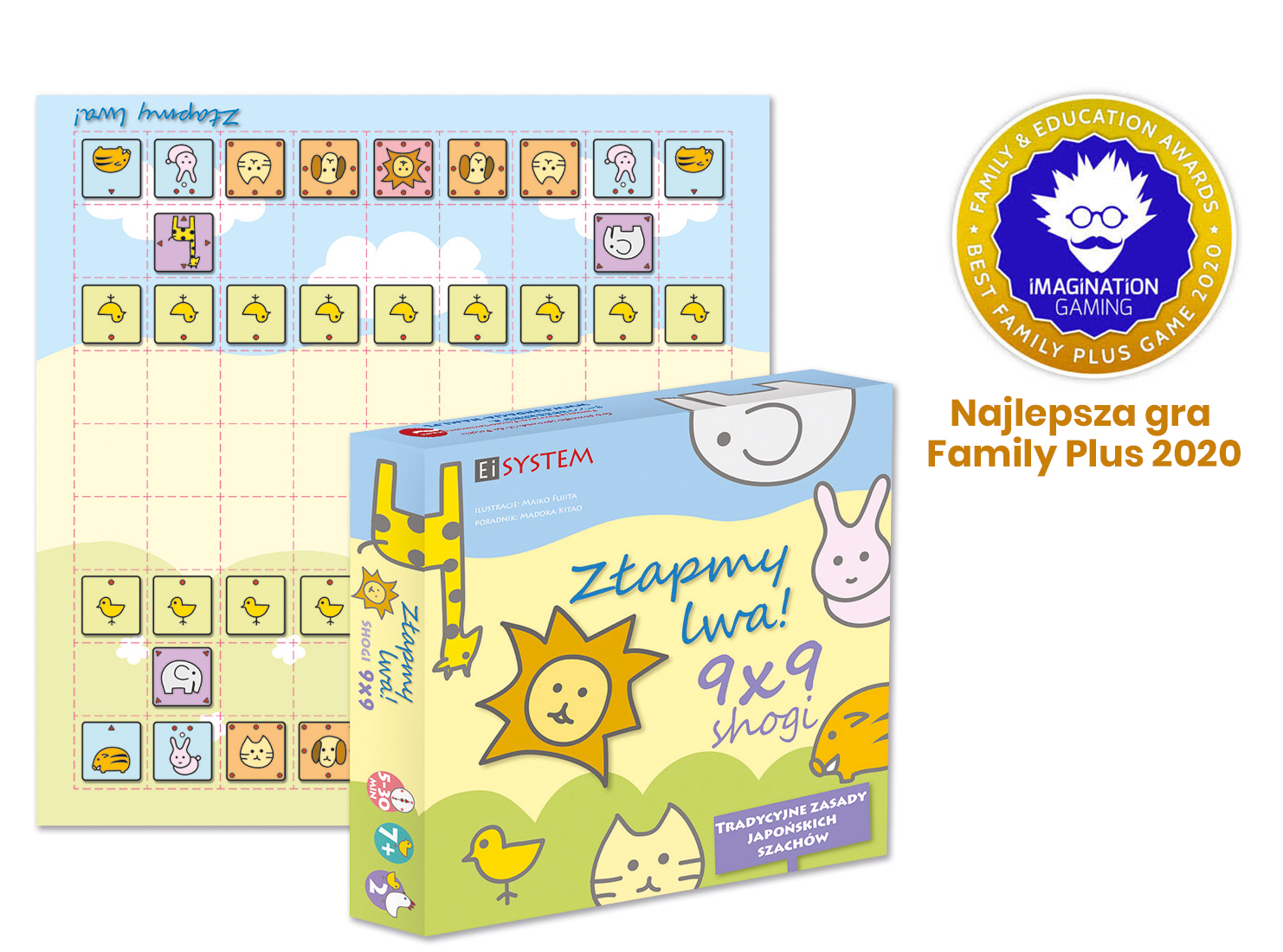 Gra dla 2 graczy w wieku od 10 lat. Oceniania w rankingu Imagination Gaming wyżej od topowych gier. Autorka gry: Madoka Kitao Ilustracje: Maiko Fujita To bardziej zajmujące niż szachy! Jestem zauroczona. Uważam, że stworzenie wersji zwierzątkowej, w które może zagrać Europejczyk bez konieczności żmudnego zapoznawania się z Kanji oraz pamiętania 15 różnych figur, było świetnym posunięciem. I niezmiernie się cieszę, że gra ta trafiła pod polskie strzechy (tu wielkie ukłony dla EiSystem). Złapmy lwa: Shogi to coś, z czym każdy szachista powinien się zapoznać. Nie-szachista zresztą też. Ja w szachy grać nie lubię, bo nie potrafię sobie wymyślić strategii. Prędzej czy później zawsze ląduję w pozycji defensywnej. W Złapmy lwa 9×9 grało mi się wspaniale już od samego początku (pomijając partie wybitnie nierówne, kiedy grałam z szachistą - ale i wtedy była to partia o wiele bardziej emocjonująca niż zwykłe szachy). A szachista stwierdził, że Złapmy lwa 9×9 daje więcej możliwości strategicznych. Że jest ciekawsza. I że zwyczajnie jego szare komórki bardziej pracują ;) Gamesfanatic PRESTIŻOWA NAGRODA DLA GRY ZŁAPMY LWA! Miło nam poinformować, że gra Złapmy Lwa 9×9 otrzymała Złoty medal za najlepszą grę Family Plus 2020 roku przyznawaną przez Imagination Gaming. Do konkursu trafiają zgłoszenia z całego świata od wydawców i projektantów. Każda przesłana gra jest pokazywana na wielu kongresach w całej Wielkiej Brytanii. https://imaginationgaming.co.uk/ig-awards/past-winners x