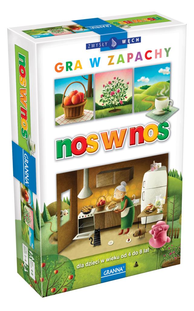 Już przy okazji świetnej gry BimBom wspominałam o tym, że człowiek pozbawiony któregokolwiek ze zmysłów zupełnie inaczej się rozwija. Nasze zmysły bowiem wzajemnie na siebie wpływają. Spróbujcie chociażby zjeść obiad z zatkanym nosem - to już nie będzie to samo! Wydawnictwo Granna stworzyło zaskakującą grę opartą właśnie na zapachach. Zasady są proste i możemy je zmieniać w zależności od tego, na jaki rodzaj rozgrywki mamy ochotę, bądź w jakim wieku są gracze. Możemy korzystać z gry jak z loteryjki obrazkowej, grać w popularne pary i szukać pasujących do siebie obrazków lub bawić się w rozpoznawanie zapachów i szukanie odpowiedniej tekturki. Dużym plusem gry jest to, że mogą w nią grać już zupełne maluchy (od 4 lat). Wszystkie dzieci, z którymi do tej pory grałam były mocno zaintrygowane i ożywione. Miło było patrzeć, jak wspólnie dyskutują o tym, co czują i z czym im się dany zapach kojarzy. Poza tym Nos w nos można dostosować do grupy, która z nami gra: młodszym ułatwić, a starszym utrudnić lub urozmaicić. W grze mamy do dyspozycji po 4 tekturki związane z każdym z zapachów i sześć pojemniczków z zapachami. Mnie akurat większość z nich kojarzy się z dzieciństwem. Mydło idealnie obrazuje mydła, które pamiętam sprzed lat! Podobnie jest z zielonym jabłuszkiem, które budzi wspomnienia pierwszego szamponu... Pozostałe zapachy, to dym, koszona trawa, róża i mięta. Pojemniczki z zapachami są solidnie wykonane i zakręcane, więc zapach nie ucieka. Zachwycają mnie też śliczne ilustracje, które wykorzystam też w swoim logopedycznym świecie. Po rozegraniu paru partii Nos w nos możemy stworzyć swoją własną wersję tej gry! Wyjąć z szafki przyprawy, z ogrodu przynieść rośliny, pogrzebać w lodówce i świetnie się bawić, jednocześnie wyczuwając zmysły i rozwijając wiedzę na temat np. Przypraw i roślin. x