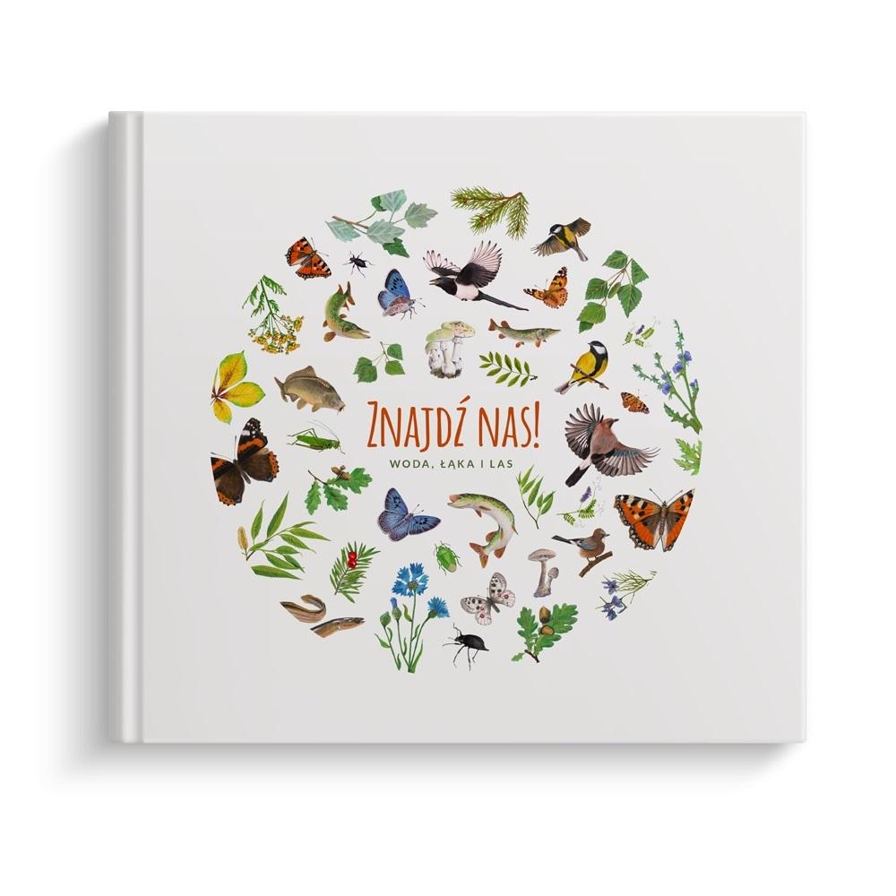 Książka Znajdź nas! Woda, łąka i las zawiera 20 pięknych dwustronicowych ilustracji wykonanych kredką ołówkową, na których pośród różnych sylwetek konkretnego gatunku jest ukryta jedna sylwetka innego gatunku. Należy ją odnaleźć. To pierwsza część zabawy. Drugą częścią książki są opisy gatunków, które zostały zilustrowane. Dzieci chętnie je poznają, by odszukać raz jeszcze i już nazwać. Starsze dzieci warto zachęcić do liczenia karpi, sójek, gałązek i motyli. Reguły każdy może wymyślić sam!