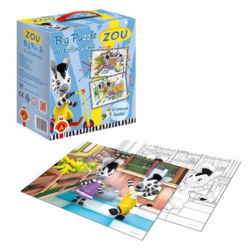 Opakowanie zawiera 2 układanki (puzzle)o wymiarach 67/47 cm. Po jednej stronie każdej układanki znajduje się kolorowy obrazek do złożenia. Po drugiej strony znajduje się konturowy rysunek do złożenia i kolorowania. Kolorowe puzzle są jednocześnie wzorem do rysowania (lub malowania) puzzli czarno - białych.