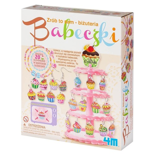 Zawartość: - stand na biżuterię w kształcie patery (13 cm wysokości) - 20 babeczek z magicznego arkusza - 4 kredki - 1 szablon graficzny - 2 łańcuchy na breloczki i 4 haczyki do kolczyków - zawleczki - sznurek - kolorowe koraliki x